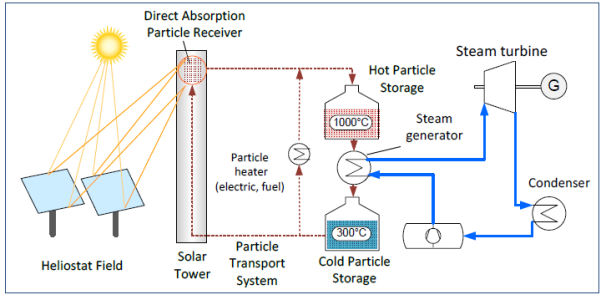 A simplified scheme of the HIFLEX system with solid particles is shown in above Figure. The solar radiation is concentrated by heliostats onto the direct absorption particle receiver, where the particles are heated up (e.g. to 1000°C) while passing through the receiver. The hot particles are then stored in the hot storage container. For power production, particles are passing through the steam generator to generate steam for the steam cycle for power production. After passing through the steam generator, the cooled particles are collected in the “cold” storage (e.g. at 300°C). During sunshine hours, the particles are transported up to the tower and get heated again. Hot and cold temperatures of the particles can be selected according to a techno-economic optimization, without strict technical limits. Unlike with molten salt, the particle system does not experience the danger of fluid freezing and thus does not need any trace heating.