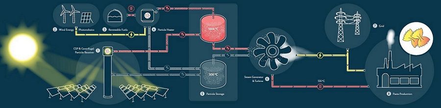 Hi-Flex is a tower type concentrated solar power plant which will be built in Barilla’s Foggia pasta factory in Italy to supply process steam. During the HIFLEX project the worldwide first complete pre-commercial system using particle technology will be developed, built and demonstrated by eleven different partners; from seven different countries. The demonstration plant with 20 MWh thermal energy storage and a 2.5 MWth receiver includes all components of a commercial-scale plant except for the state-of-the-art steam turbine.